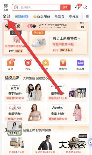 1、打开APP进入首页可看到各类商品推荐及频道分类,点击全部能展开更多分类选项,按品类查找心仪商品,方便筛选浏览海量商品。