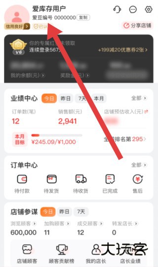 2、点击APP界面中的个人头像区域进入用户中心,在这里可查看爱库存编号、信用情况、业绩中心、订单中心以及店铺参谋等信息。