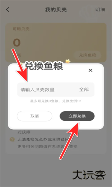 4、输入贝壳数量后,点击立即兑换即可使用贝壳兑换鱼粮。
