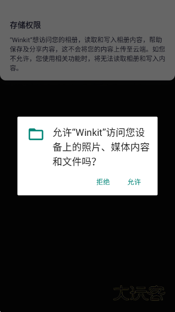 1、首次使用时,会弹出存储权限请求弹窗,点击“允许”,使APP能访问设备照片、媒体内容和文件,以便后续读取和保存创作内容。