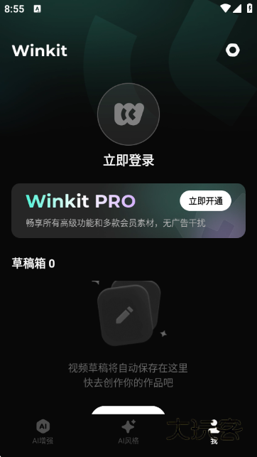 2、进入“我”的页面,可选择“立即登录”,也可开通Winkit PRO,畅享所有高级功能、多款会员素材且无广告干扰,还能查看草稿箱(若有创作草稿会自动保存于此)。