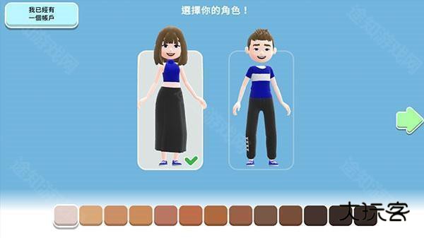 3、选择自己的角色性别和肤色,然后点击右侧箭头进行下一步。