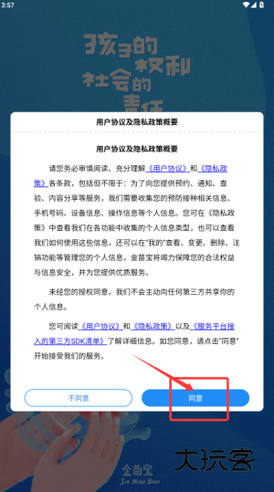 1、启动金苗宝应用,先在隐私政策页面点击同意按钮继续操作。
