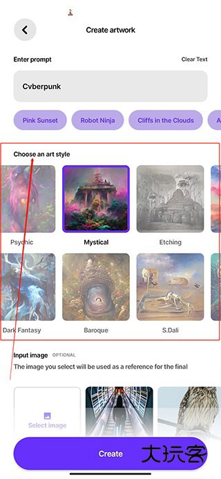 3、然后看到下方 「Choose an art style」 选择想要的风格,这里我推荐Fantasy Art 这个效果,比较接近赛博朋克的感觉!