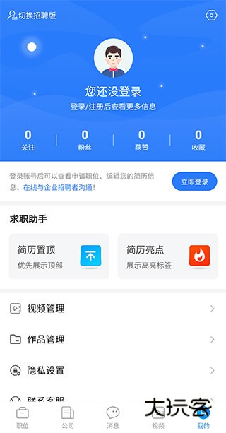 5、如果想要正常使用软件的全部功能,就需要到【我的】页面进行注册登录,点击左上角还可以切换为招聘版。