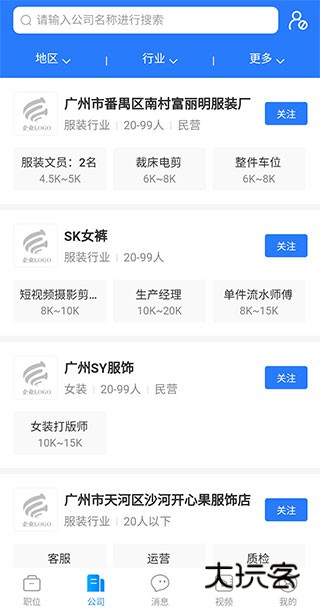 2、切换到【公司】页面之后,我们还能看到非常多的服装公司,对于自己比较感兴趣的公司还可以选择关注。