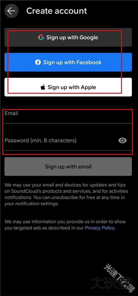 2、输入邮箱账号和密码,点击sign up with email