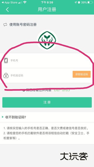 3、用手机登录,点击“获取验证码”,再点击“注册”