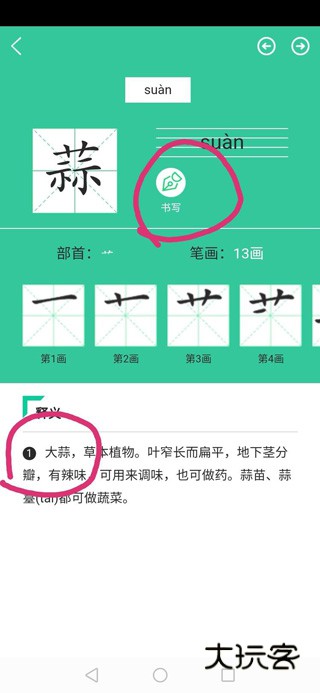 9、点击每一个生字,点击“书写”,有书写笔顺,下面是生字的组词。