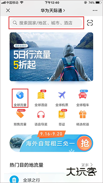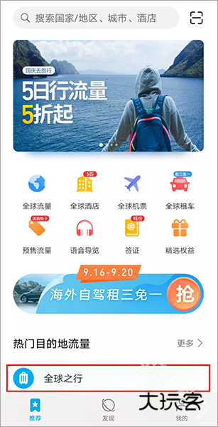 1、打开天际通App,点击页面顶部"搜索栏"或点击"全球流量",搜索目的地;