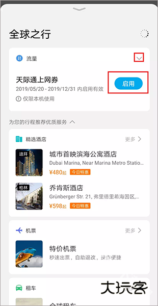 4、在行程卡片中,点击启用按钮连接上网即可;