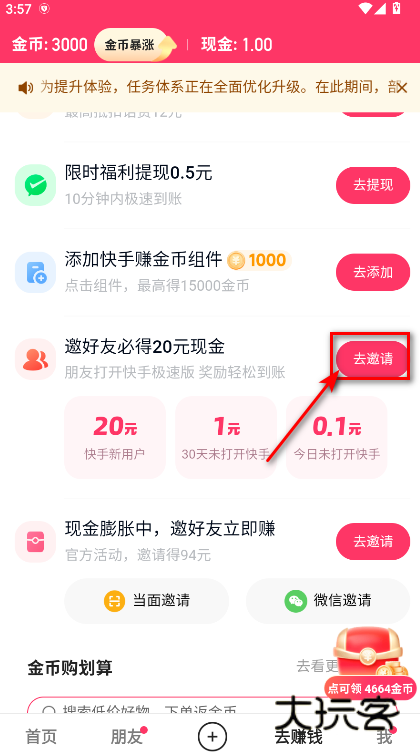 官方任务:通过“邀请新用户”任务,每邀请一位未注册过快手极速版的新用户,累计签到7天可获得约43元现金奖励(约合5000金币)。