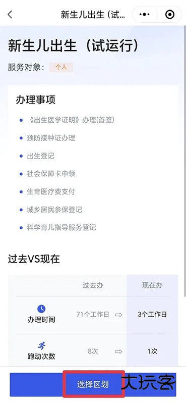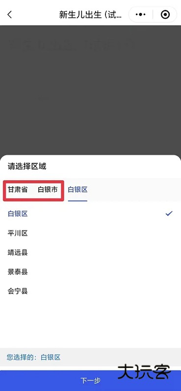 3、选择新生儿出生所在区域,进行下一步。