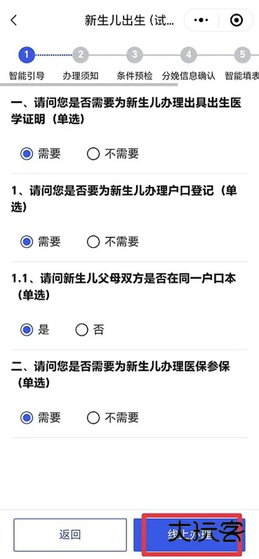 5、根据提示,对以下问题做出勾选,点击线上办理。