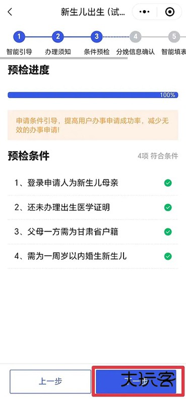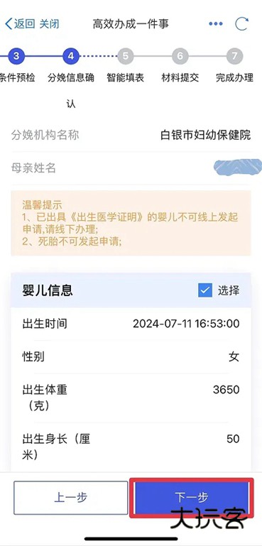 8、核对婴儿信息,点击下一步。