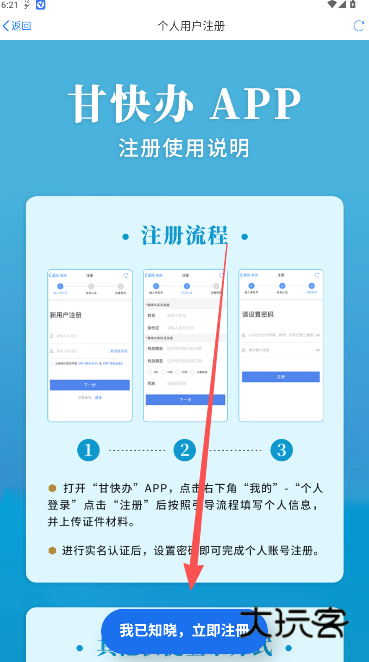 2、查看图示注册流程说明,完整浏览过后,点击我已知晓,立即注册。