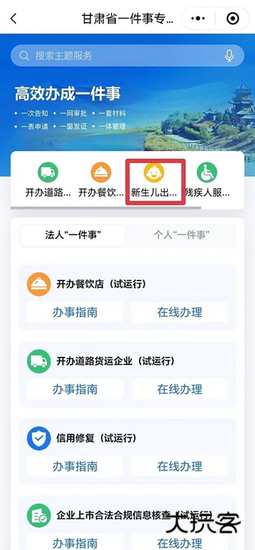 1、点击甘快办APP新生儿出生(试用行)版块。