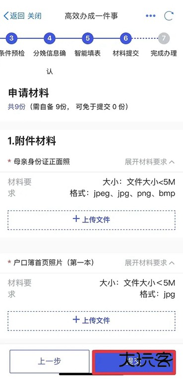 10、根据提示,上传相关照片。包括:父母亲身份证正反面照片、户口簿首页照片(如果父母双方不在同一个户口本上,则2个户口簿首页照片都需拍照)、户口簿父母亲页照片和结婚证照片,点击提交。