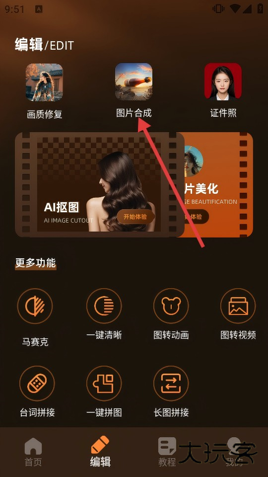 1、打开图片编辑类APP的“编辑”页面,点击【图片合成】,进入海报设计界面。