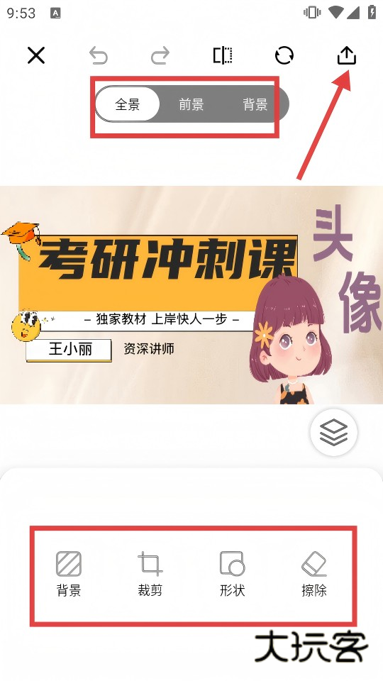 4、在编辑界面,可根据自身需求选择不同的工具编辑封面,完成后点击右上角导出图标,导出制作好的课程封面。