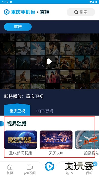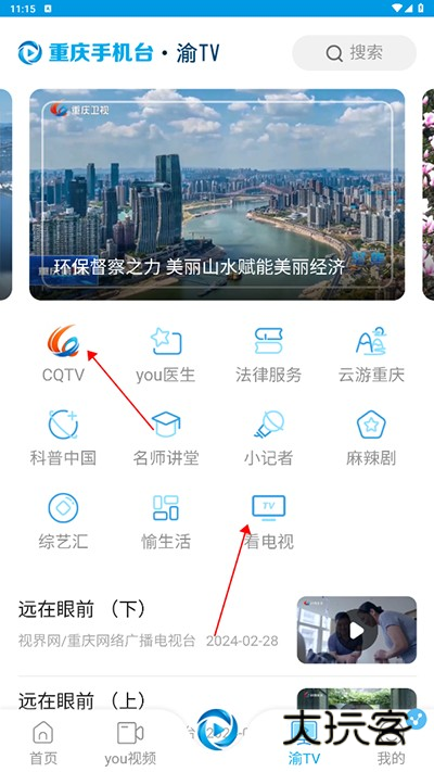 1、打开重庆手机台客户端,进入"渝tv"页面点击“看电视”或者点击“CQTV”;