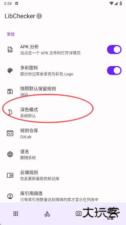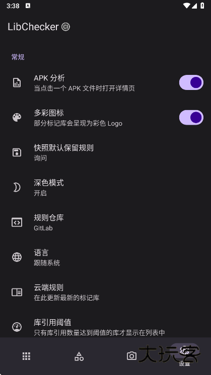 3、其次就是设置,在这里有主题背景颜色、APK分析、规则仓库、语言、云端规则等等,根据需要进行适当的调整。