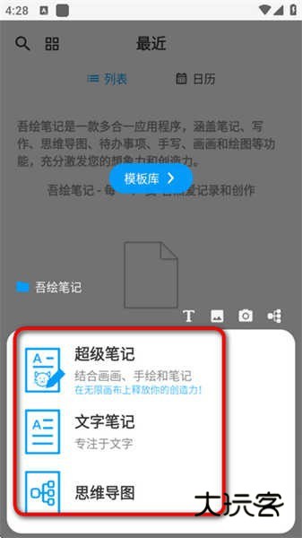 3、选择要创建的内容类型:超级笔记、文字笔记或思维导图。