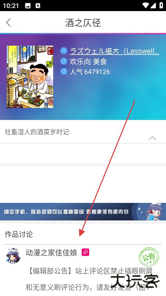 2、在酒之仄径详情页,查看作者题材人气等信息,下滑浏览作品讨论区,了解其他用户发布的编辑公告及互动内容。