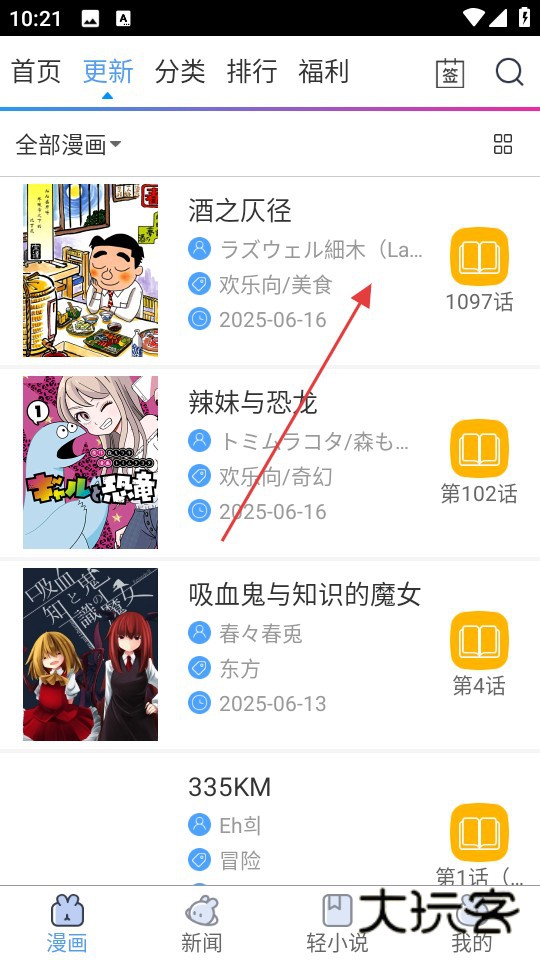 1、在漫画页面切换至更新分类,浏览酒之仄径辣妹与恐龙等漫画列表,点击酒之仄径进入作品详情页。