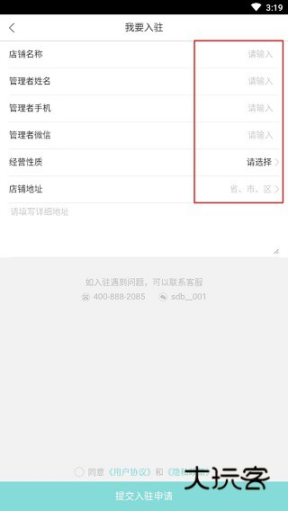 2、进入之后,填写详细的店铺名称、管理者姓名、管理者手机号、管理者微信、选择经营性质、填写详细的店铺地址即可,在提交入驻申请之前,勾选“同意《用户协议》和《隐私政策》”,接着等待审核就好啦!