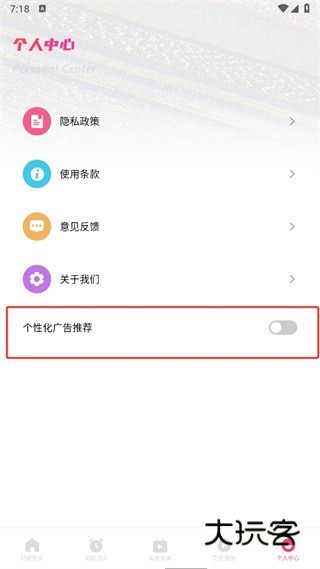 2、点击过后在个人中心的页面中直接点击关闭【个性化广告推荐】后面的按钮即可。