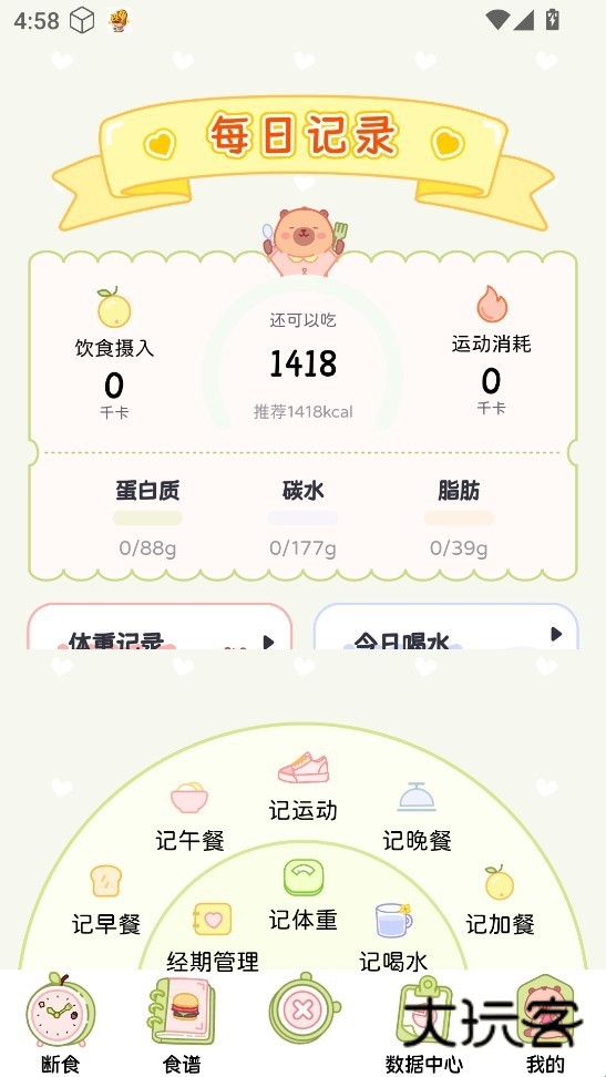 4、点击下栏中间 “+” 号,能进行早午餐、运动等多方面记录。
