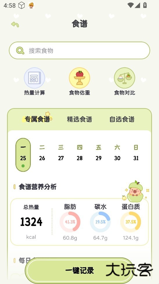 3、食谱页面,可记录饮食并估算热量。