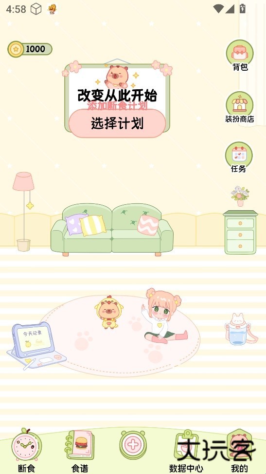 2、进入软件,断食页面可添加断食计划,做任务养小宠物。