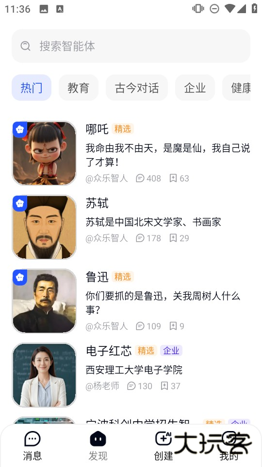 2、发现页选【热门-教育-古今对话】分类,或点击【哪吒-苏轼-鲁迅】等智能体互动。
