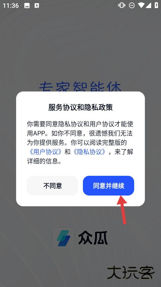 1、阅读【服务协议和隐私政策】,点击【同意并继续】,进入智能体发现界面。
