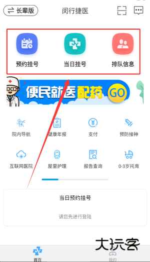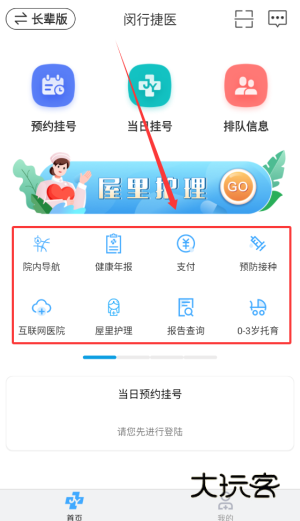 2、首页设有预约挂号、当日挂号与实时排队信息查询等核心就诊服务。