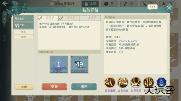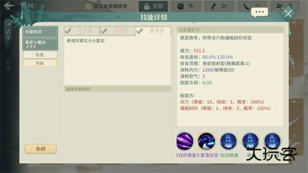 一个不怎么常用的剑系武学,在2.0后加强了一波,以前版本只能打一波输出就萎了,2.0后武学三突的北斗七星剑天赋会消耗所有怒气提升技能威力,可能会稍微持久一些,但是想想苏轼,开场自带五怒,5*30是150的技能威力提升,这一剑爆发很高。