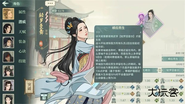 拥有独特的减队友cd的天赋,需要刷cd的阵容用翠秀都很强。绝翠秀的身板比甲翠秀优秀不少,但是绝翠秀的潜质天赋顺应而生需要绑定自带武学使用,而且要和寒烟一起上场。有点不够厚道,常规使用场景是作为太极拳载体给主角刷CD用,河洛拳黄天破军都能用到,而使用紫薇刀作为通玄位出现时多是在遁甲里用。
