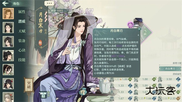 PVE马马虎虎,下文不说PVE就是默认常规没什么特色的。PVP目前是除辛弃疾外最好的藏渊载体,混伤输出,月白寒刃天赋根据自身定力全屏刮痧,不突破时只有使用剑系武学才生效,三突后使用剑拳奇门都生效,这让张月有了不少可玩性,以后出什么强势通用武学都可以给张月用。