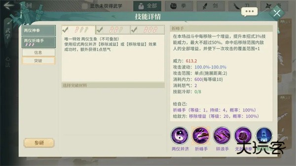 同为打拳武学,其实也不差,但是前有太极拳,被太极拳的光辉掩盖,打拳为啥不打太极拳呢,使用不多的还不错的绝武学。1突就能很好用,清敌方增益,清自身减益,每个技能都需要耗怒两点,常规用法就是辛弃疾破阵子潜质使用,拳拳破盾,打华山这种加盾的门派非常好用,或者楚狂潜质使用当个战士,楚狂还没削弱时,两仪楚狂也是能一打四的存在,不过都是过去了,如今老辛都玩剑去了,难以从ban位下来,两仪拳还能给铃兰使用,铃兰每使用耗怒的技能都能给对面叠加睡眠,睡眠又会受到基于铃兰定力的特殊伤害,拿来当个副输出还不错,还有恒山玩反击两仪拳,具体怎么样不得而知。