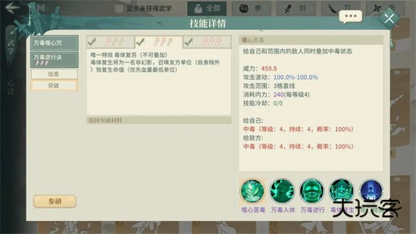 自带武学三技能降低对方全体攻击力PVP效果会折半,不过也是个还不错的紫色状态了,武学三突后四技能会误伤友军,有利有弊,翠秀自带武学使用的不多,作为载体还算优秀,可能待开发。
