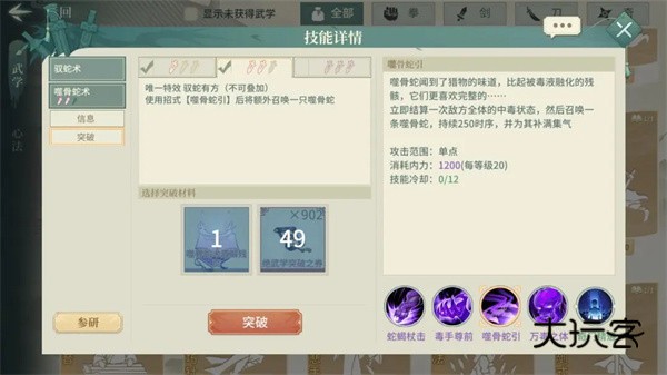 武学二突后可以召唤两条蛇的毒系武学,很适合需要刷白驹CD的阵容使用,召唤的蛇自带5.0集气,蛇攻击中毒的敌人还可以吸血,能一定程度克制破军门派,河洛剑宗八门都能用,在河洛几乎是必备的,可代替秒针的位置。常用载体有甲耶律红,绝屈心,王维,银珊,文天祥,张良,陆游,枕徽等等。