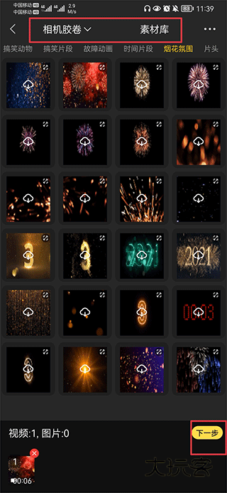 2、进入后在相册中选择要剪辑的视频,也可以在素材库中选择喜欢的素材,然后点击下一步