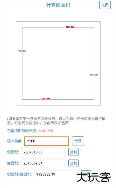 3、输入柱子高度后点“计算”,就能看到底面积、侧面积、底面+侧面3种组合面积