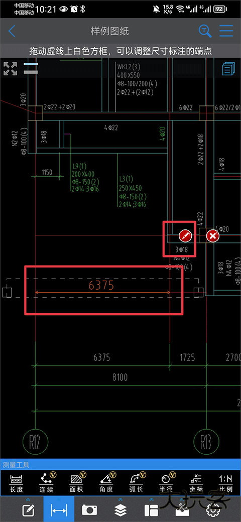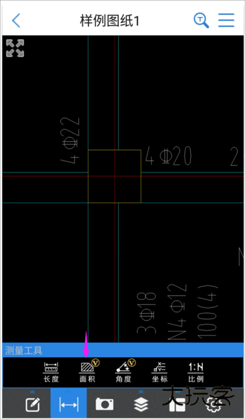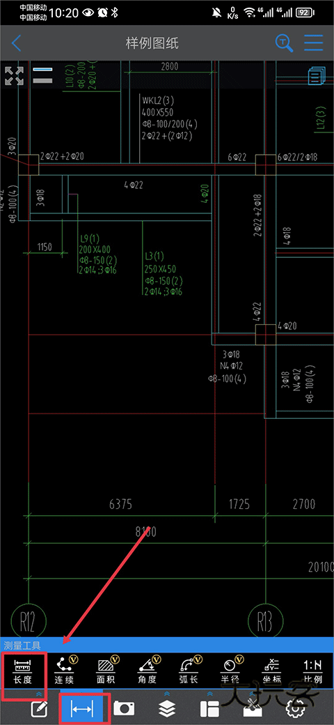 2、进入后将图纸放大,并在下方功能中的测量工具内点击长度