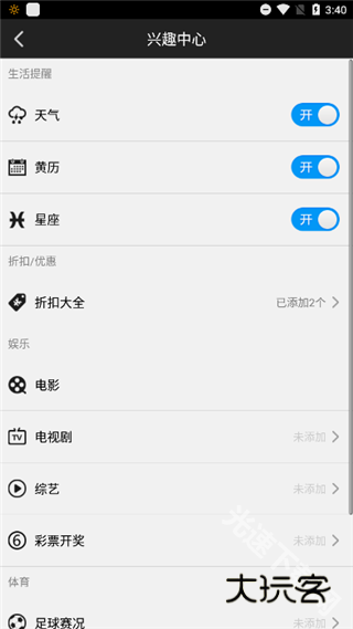 5、当然你也可以进兴趣中心查看自己的设置,如:电视剧、综艺等,甚至还可以开启一些生活提醒等。