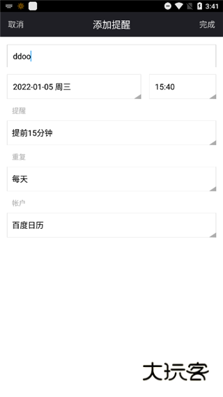 3、输入日程标题、日程提醒时间,OK后,点击“完成”;