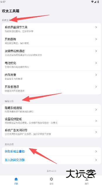 1、欢太工具箱4.0功能页面按照系统工具、增强功能以及其他选项三个部分组成。