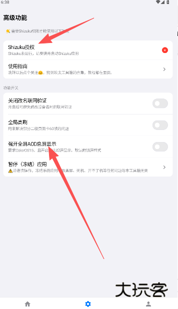 3、高级设置页面主要针对联网验证测试部分所设立,需要借助shizu工具修改确认,包括冻结后台应用,联网验证改名等部分。